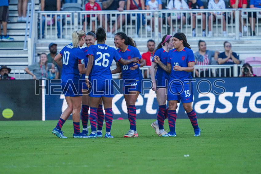 Fort Lauderdale, USA, December 2, 2023, U.S. National Women's Team players celebrate goal in a friendly match at DRV PNK Stadium. (Photo Credit: Marty Jean-Louis)