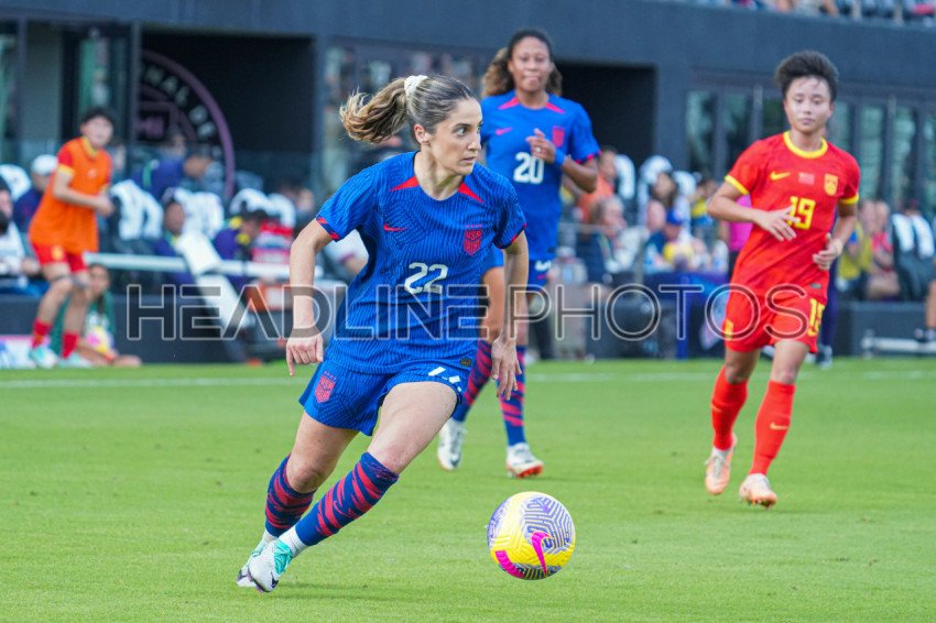 Fort Lauderdale, USA, December 2, 2023, U.S. National Women's Team player Savannah DeMelo #22 look to make a pass in a friendly match at DRV PNK Stadium. (Photo Credit: Marty Jean-Louis)