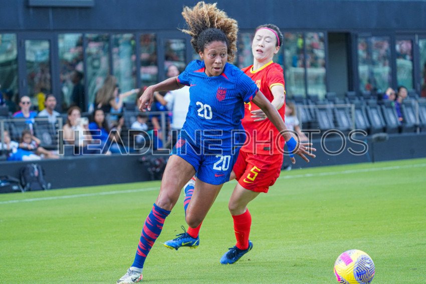 Fort Lauderdale, USA, December 2, 2023, U.S. National Women's Team defender Casey Krueger #20 runs after the ball in a friendly match at DRV PNK Stadium. (Photo Credit: Marty Jean-Louis)