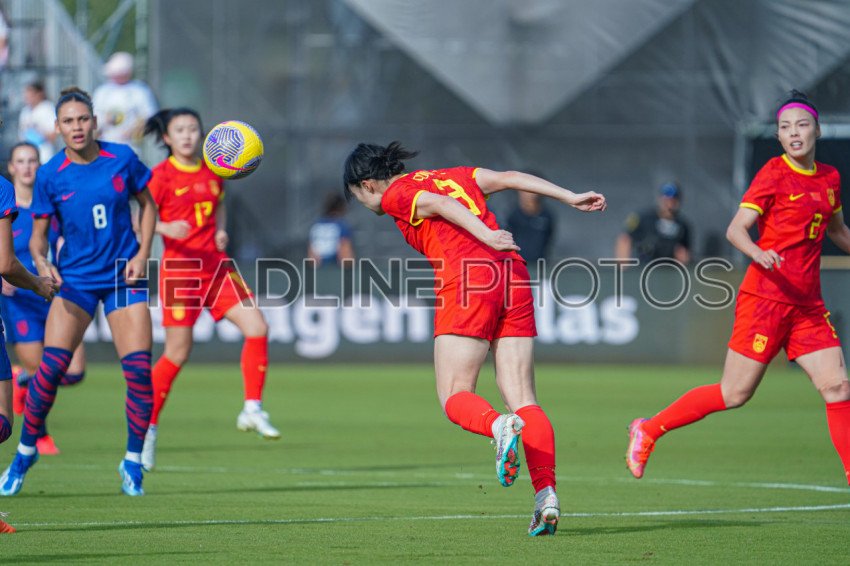 Fort Lauderdale, USA, December 2, 2023, China PR defender Dou Jiaxing #3 makes a header in a friendly match at DRV PNK Stadium. (Photo Credit: Marty Jean-Louis)