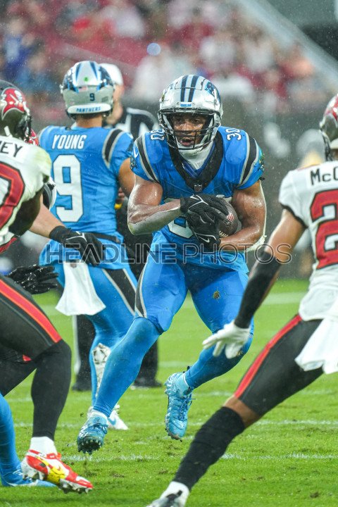 Tampa Bay, Florida, USA, December 3, 2023, Carolina Panthers runningback Chuba Hubbard #30 makes a run at Raymond James Stadium. (Photo Credit: Marty Jean-Louis)