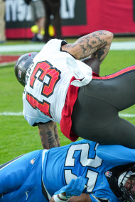 Tampa Bay, Florida, USA, December 3, 2023, Tampa Bay Buccaneers wide receiver Mike Evans #13 gets tackled by Jammie Robinson#22 at Raymond James Stadium. (Photo Credit: Marty Jean-Louis)