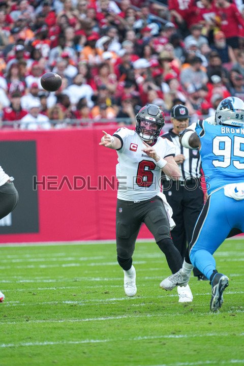 Tampa Bay, Florida, USA, December 3, 2023, Tampa Bay Buccaneers quarterback Baker Mayfield #6 makes a pass at Raymond James Stadium. (Photo Credit: Marty Jean-Louis)