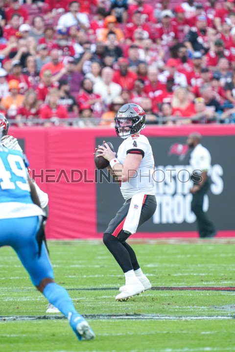 Tampa Bay, Florida, USA, December 3, 2023, Tampa Bay Buccaneers Quarterback Baker Mayfield #6 look to make a pass at Raymond James Stadium. (Photo Credit: Marty Jean-Louis)