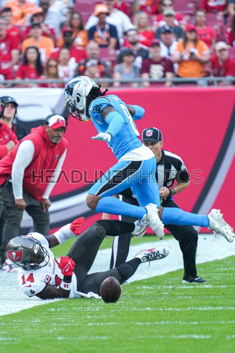 Tampa Bay, Florida, USA, December 3, 2023, Tampa Bay Buccaneers Wide Receiver Chris Godwin #14 misses the ball as Jaycee Horn #8 leaps at Raymond James Stadium. (Photo Credit: Marty Jean-Louis)