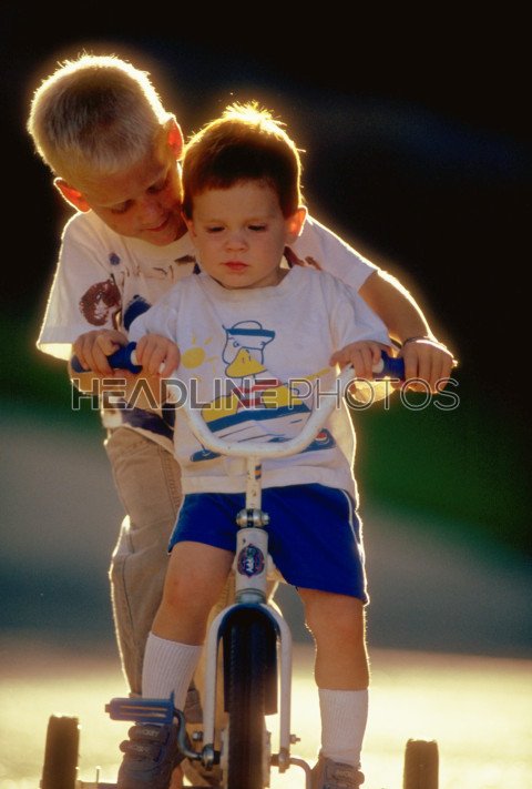 Cute boy riding pedal carcar with brather in garden