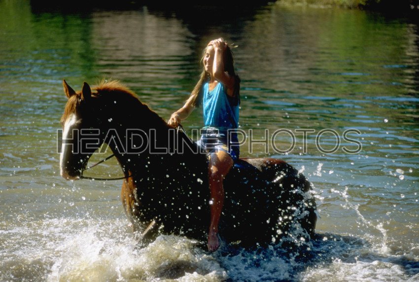 Pretty girl riding horse in river water