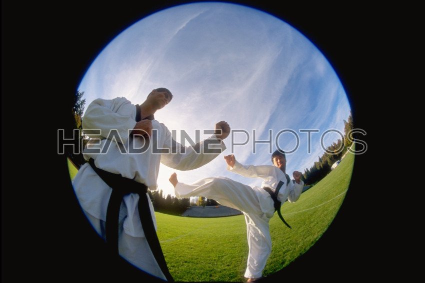 Men Kicking Punching Fighting During Combat Sport Karate Simulat
