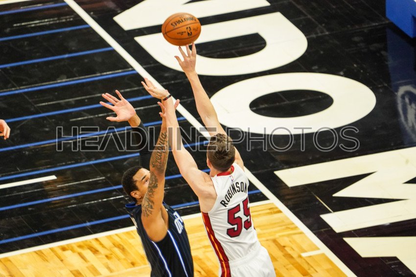 Orlando, Florida, USA, March 14, 2021, Miami Heat's Duncan Robinson #55 makes a shot against the Orlando Magic at the Amway Center (Photo Credit: Marty Jean-Louis)