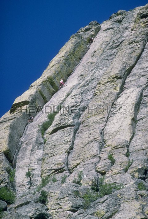 Rock climber scaling steep rock face
