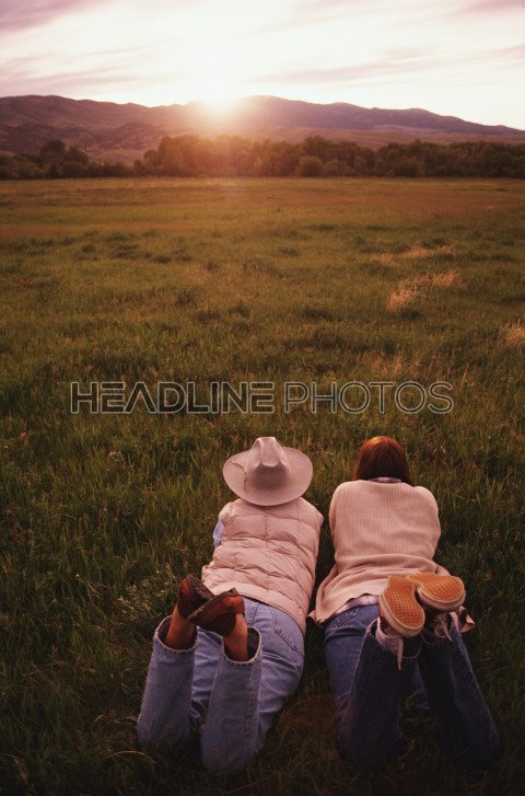Young couple, a cowboy and a cowgirl, relaxing while lying down in the grass