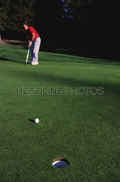 Slow motion golfer putting golf ball into hole on green golf on summer vacation
