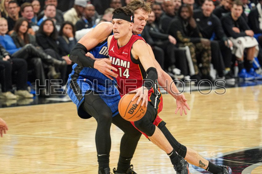 Orlando, Florida, USA, December 20, 2023, Miami Heat guard Tyler Herro #14 runs pass Moritz Wagner #21 at the Amway Center. (Photo Credit: Marty Jean-Louis)