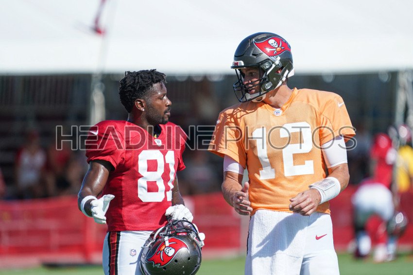 Tampa, Florida, USA, August 19, 2021, Tampa Bay Buccaneers Quaterback Tom Brady #12 and Wide Receiver Antonio Brown #81 having a chat during Training Camp at AdventHealth Training Center\n. (Photo Credit: Marty Jean-Louis)