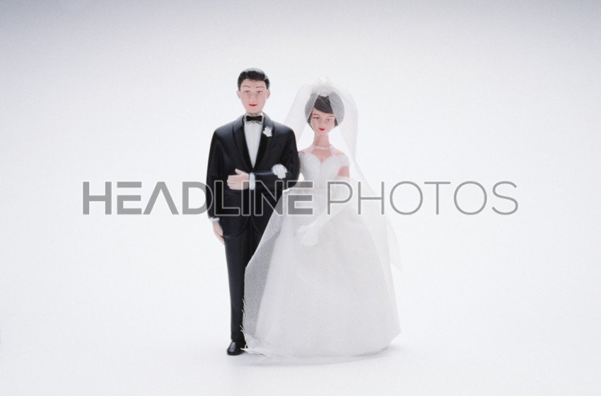 Close up of miniature figurine figures of people as marriage couple Bride & wedding dress bouquet horseshoe & Groom as weddings cake topper decoration