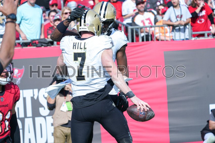 Tampa Bay, Florida, USA, December 31, 2023, New Orleans Saints player Taysom Hill #7 celebrate after making a touchdown at Raymond James Stadium. (Photo Credit: Marty Jean-Louis)