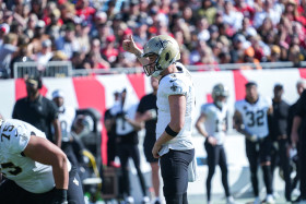 Tampa Bay, Florida, USA, December 31, 2023, New Orleans Saints quarterback Derek Carr #4 gives a thumbs up at Raymond James Stadium. (Photo Credit: Marty Jean-Louis)