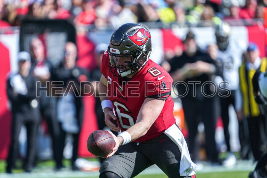 Tampa Bay, Florida, USA, December 31, 2023, Tampa Bay Buccaneers quarterback Baker Mayfield #6 makes a pass at Raymond James Stadium. (Photo Credit: Marty Jean-Louis)