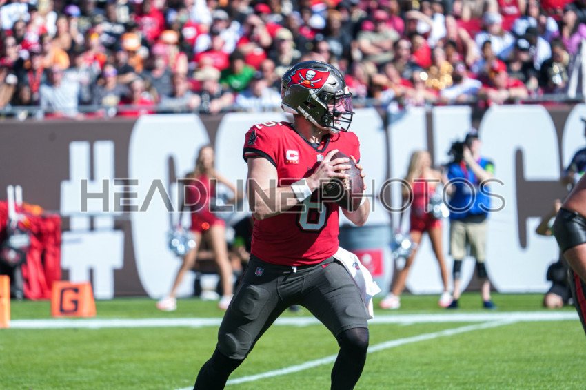 Tampa Bay, Florida, USA, December 31, 2023, Tampa Bay Buccaneers quarterback Baker Mayfield #6 makes a pass at Raymond James Stadium. (Photo Credit: Marty Jean-Louis)