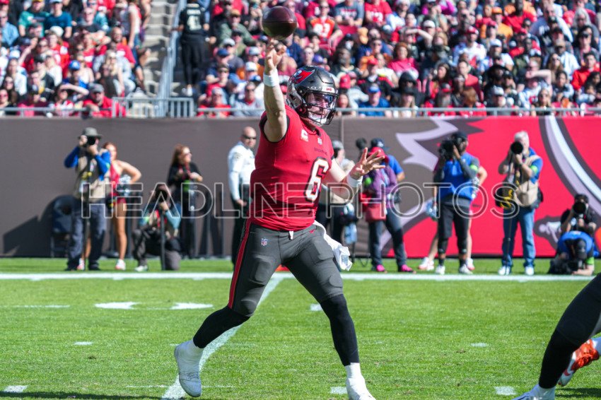 Tampa Bay, Florida, USA, December 31, 2023, Tampa Bay Buccaneers quarterback Baker Mayfield #6 makes a pass at Raymond James Stadium. (Photo Credit: Marty Jean-Louis)