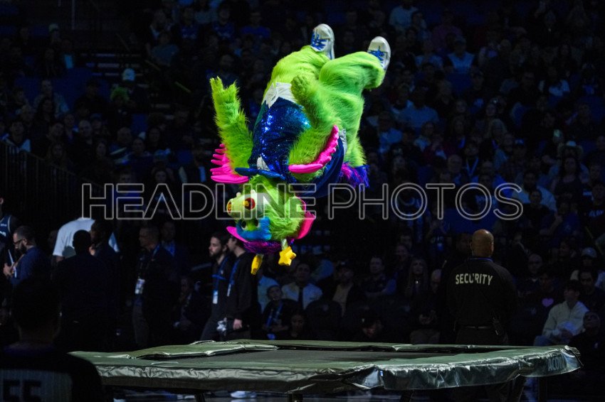 Orlando, Florida, USA, January 9, 2024, Orlando Magic mascot stuff the magic dragon during a time out at the Amway Center. (Photo Credit: Marty Jean-Louis)