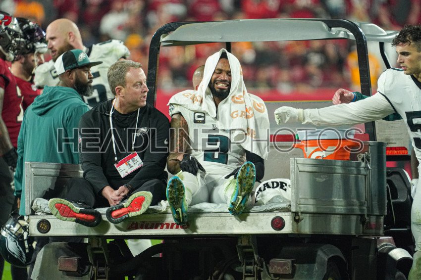 Tampa Bay, Florida, USA, January 15, 2024, Philadelphia Eagles player Darius Slay #2 is being escorted out of the field by the medical staff at Raymond James Stadium. (Photo Credit: Marty Jean-Louis)