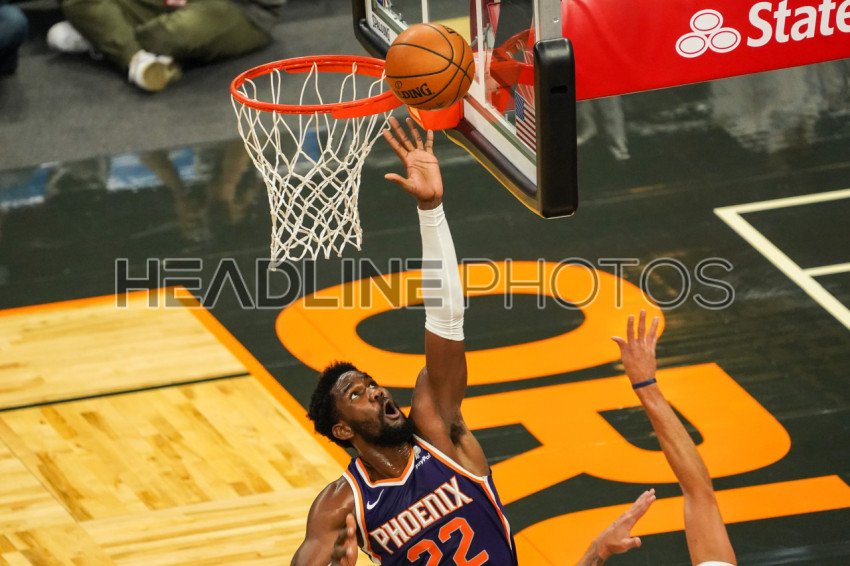 Orlando, Florida, USA, March 23, 2021, Phoenix Suns' Deandre Ayton #22 attempt to block a shot during the game at the Amway Center (Photo Credit: Marty Jean-Louis)