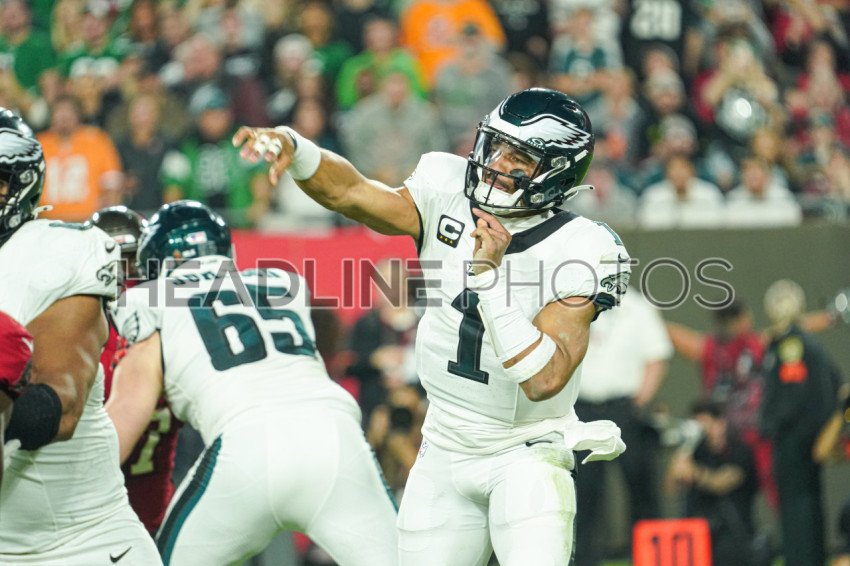 Tampa Bay, Florida, USA, January 15, 2024, Philadelphia Eagles quarterback Jalen Hurts #1 makes a pass at Raymond James Stadium. (Photo Credit: Marty Jean-Louis)