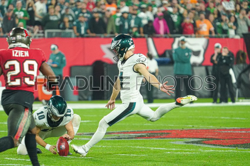 Tampa Bay, Florida, USA, January 15, 2024, Philadelphia Eagles kicker Jake Elliott #4 makes a kick at Raymond James Stadium. (Photo Credit: Marty Jean-Louis)