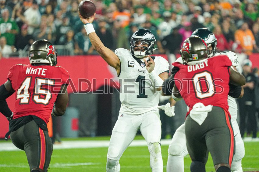 Tampa Bay, Florida, USA, January 15, 2024, Philadelphia Eagles quarterback Jalen Hurts #1 makes a pass at Raymond James Stadium. (Photo Credit: Marty Jean-Louis)