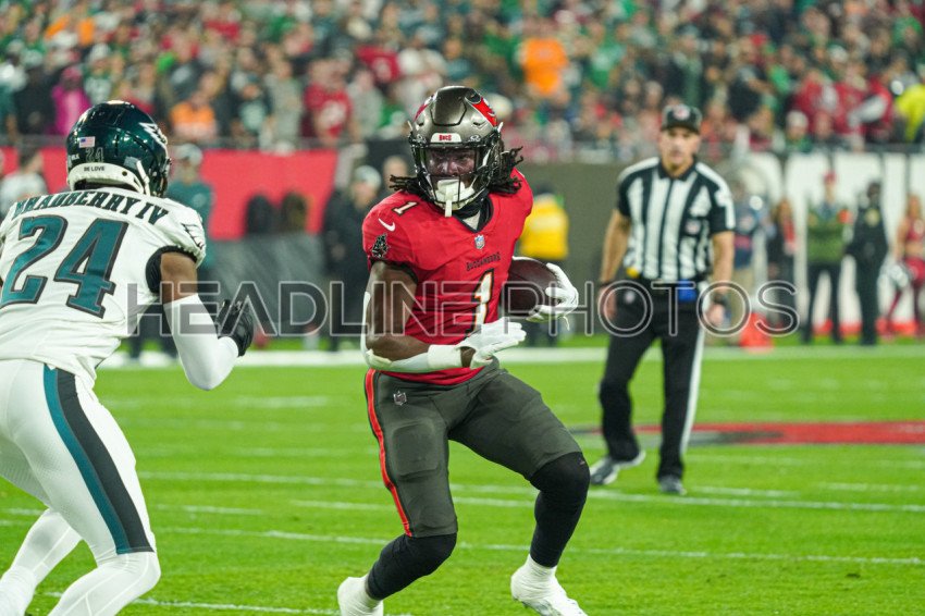 Tampa Bay, Florida, USA, January 15, 2024, Tampa Bay Buccaneers running back Rachaad White #1 makes a run after a sucessful catch during the first quarter at Raymond James Stadium. (Photo Credit: Marty Jean-Louis)