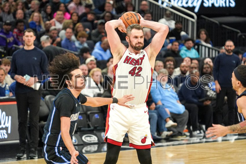 Orlando, Florida, USA, January 31, 2024, Miami Heat forward Kevin Love #42 makes a pass in the first half at the Kia Center. (Photo Credit: Marty Jean-Louis)