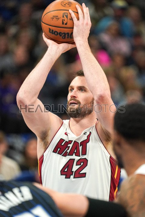 Orlando, Florida, USA, January 31, 2024, Miami Heat forward Kevin Love #42 shoots a free throw at the Kia Center. (Photo Credit: Marty Jean-Louis)
