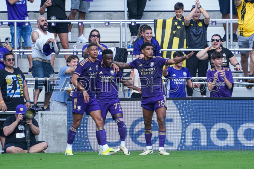 Orlando, Florida, USA, April 29, 2023, Orlando City SC during players celebrate after Ivan Angulo #77 scores in the first half the FC Series at Inter&Co Stadium. (Photo Credit: Marty Jean-Louis)