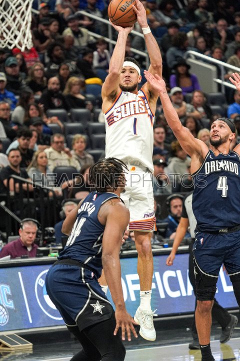 Orlando, Florida, USA, January 28, 2024, Phoenix Suns guard Devin Booker #1 shoots a three at the Kia Center. (Photo Credit: Marty Jean-Louis)