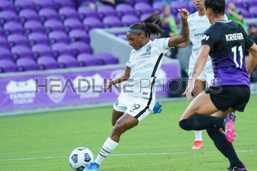 Orlando, Florida, USA, May 26, 2021, Portland Thorns forward Crystal dunn #19 makes a goal attempt at Exploria Stadium (Photo Credit: Marty Jean-Louis)