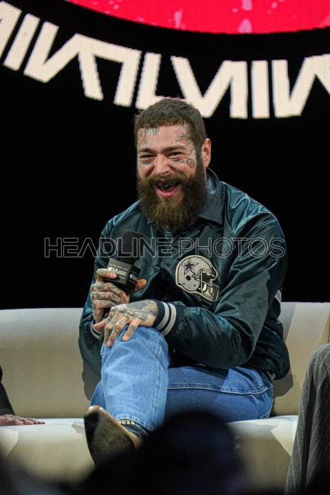 Las Vegas Nevada, USA, February 8, 2024, Rapper Post Malone speaking during the 2024 Apple Music Super Bowl Halftime Show Press Conference at the Mandalay Bay Resort (Photo Credit: Marty Jean-Louis)