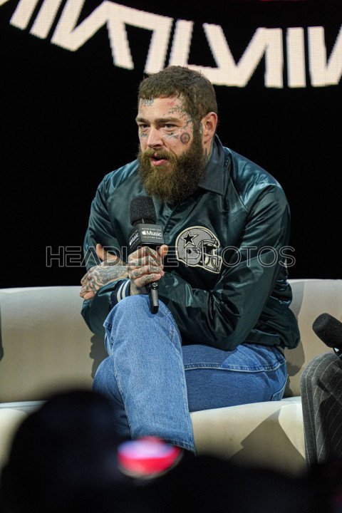 Las Vegas Nevada, USA, February 8, 2024, Rapper Post Malone speaking during the 2024 Apple Music Super Bowl Halftime Show Press Conference at the Mandalay Bay Resort (Photo Credit: Marty Jean-Louis)