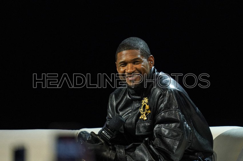 Las Vegas Nevada, USA, February 8, 2024, R&B Artist Usher speaking during the 2024 Apple Music Super Bowl Halftime Show Press Conference at the Mandalay Bay Resort (Photo Credit: Marty Jean-Louis)
