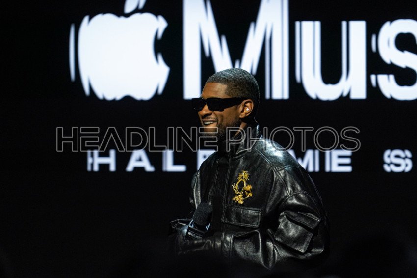 Las Vegas Nevada, USA, February 8, 2024, R&B Artist Usher enters the stage during the 2024 Apple Music Super Bowl Halftime Show Press Conference at the Mandalay Bay Resort (Photo Credit: Marty Jean-Louis)
