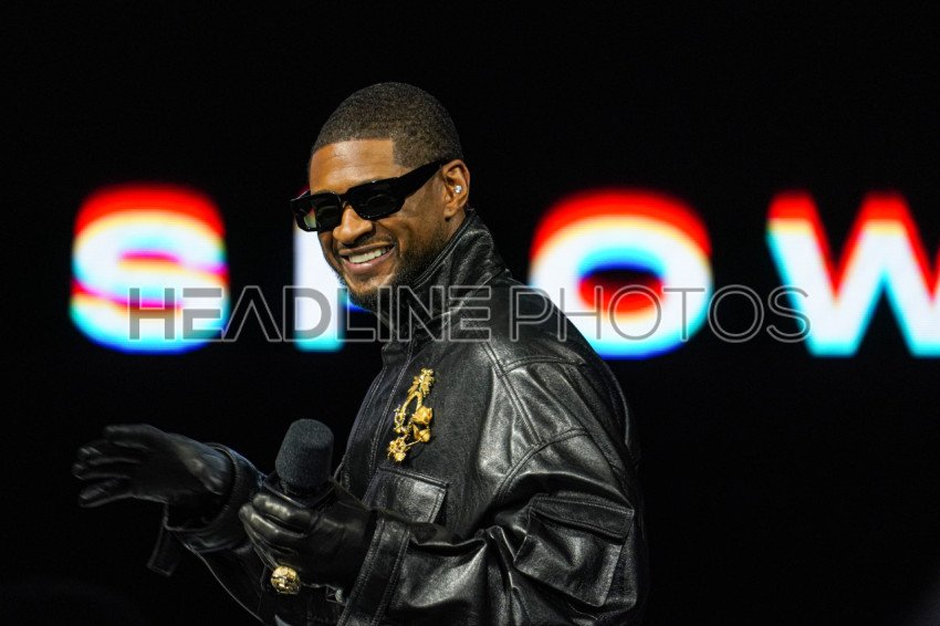 Las Vegas Nevada, USA, February 8, 2024, R&B Artist Usher enters the stage during the 2024 Apple Music Super Bowl Halftime Show Press Conference at the Mandalay Bay Resort (Photo Credit: Marty Jean-Louis)