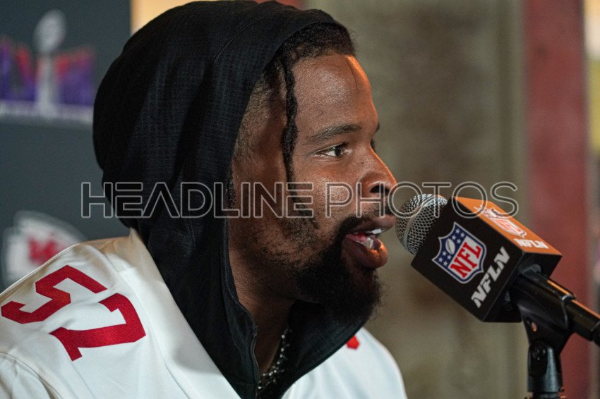 Henderson, Nevada, USA, February 8, 2024, 49ers linebacker Dre Greenlaw during the Pre Super Bowl Press Conference (Photo Credit: Marty Jean-Louis)