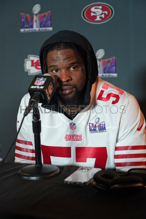 Henderson, Nevada, USA, February 8, 2024, 49ers linebacker Dre Greenlaw during the Pre Super Bowl Press Conference (Photo Credit: Marty Jean-Louis)