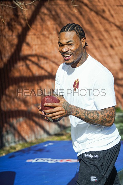 Henderson, Nevada, USA, February 9, 2024, DERWIN JAMES JR. throwing a football to one of the kids during the Walter Payton NFL Man of the Year Event At the Donald W. Reynolds Boys & Girls Club (Photo Credit: Marty Jean-Louis)
