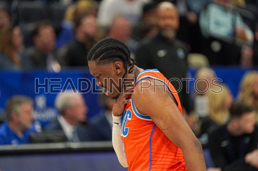 Orlando, Florida, USA, February 13, 2024, Oklahoma Thunder forward Jalen Williams #8 heads to the bench as he holds his neck during the first half at the Kia Center. (Photo Credit: Marty Jean-Louis)
