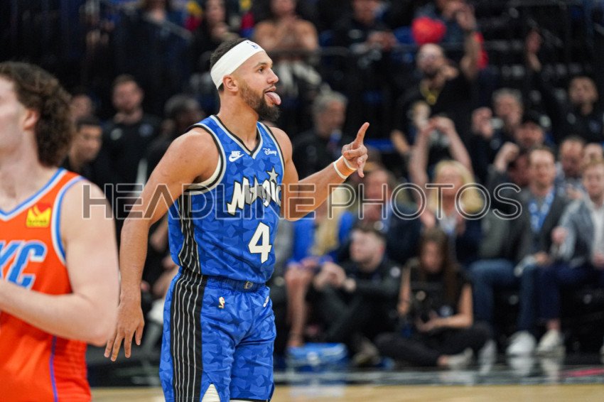 Orlando, Florida, USA, February 13, 2024, Orlando Magic guard Jalen Suggs #4 reacts after making a three in the first half at the Kia Center. (Photo Credit: Marty Jean-Louis)