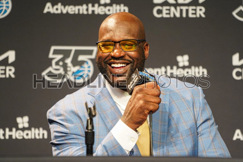 Orlando, Florida, USA, February 13, 2024, Former Orlando Magic Player Shaquille O'Neal smile during a pre-game press conference to retire his Jersey number at the Kia Center. (Photo Credit: Marty Jean-Louis)