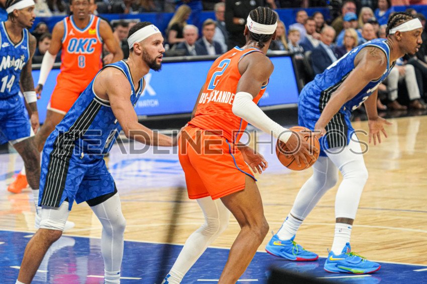 Orlando, Florida, USA, February 13, 2024, Oklahoma Thunder guard Shai Gilgeous-Alexander #2 look to make a pass as Jalen Suggs #4 add pressure during the second half at the Kia Center. (Photo Credit: Marty Jean-Louis)