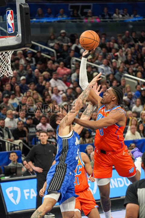 Orlando, Florida, USA, February 13, 2024, Oklahoma Thunder forward Jalen Williams #8 attempt to make a basket as Cole Anthony #50 attempt to make a block in the second half at the Kia Center. (Photo Credit: Marty Jean-Louis)