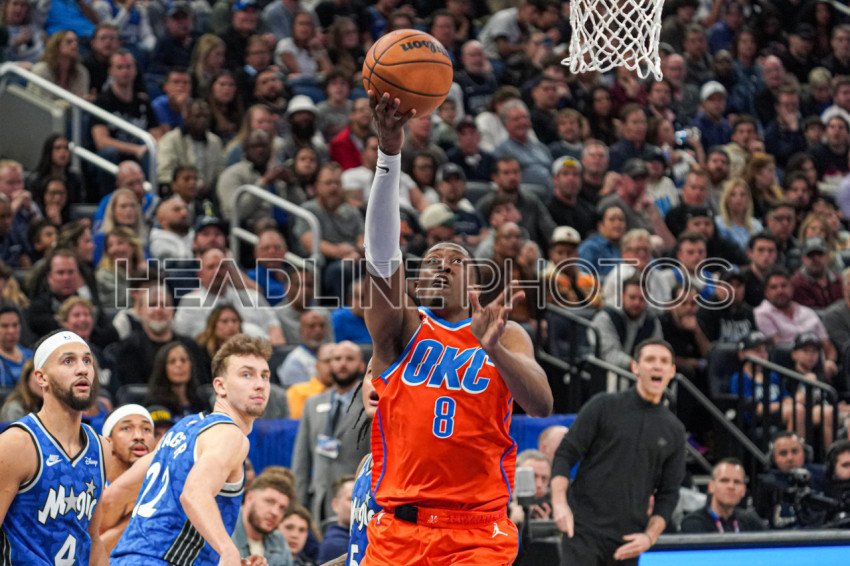 Orlando, Florida, USA, February 13, 2024, Oklahoma Thunder forward Jalen Williams #8 attempt to make a basket in the second half at the Kia Center. (Photo Credit: Marty Jean-Louis)